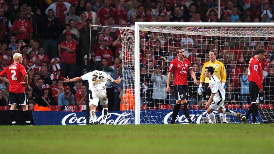 Rory Fallon wheels away in delight after scoring Swansea City's equaliser in the 2006 League One play-off final in Cardiff.