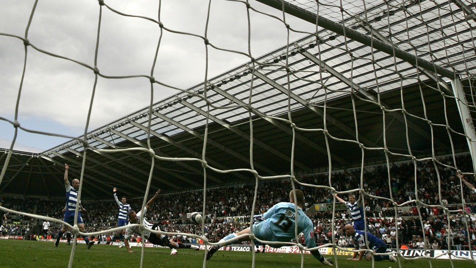 Lee Trundle sweeps the ball goalwards in a moment which might have changed the course of Swansea City history.