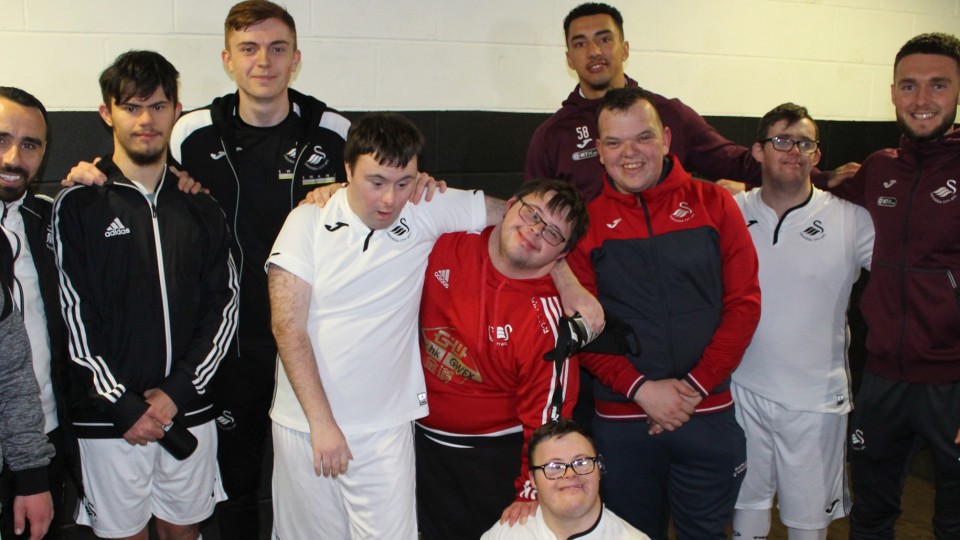 Matt Grimes, Courtney Baker-Richardson and club ambassador Leon Britton made a surprise visit to the Community Trust's Down Syndrome football session ahead of World Down Syndrome Day.