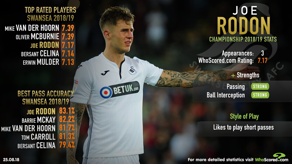 Rodon will hope to play a key role once more, with the youngster vital in Swansea developing a statistically calculated WhoScored.com style of play of ‘short passes’.