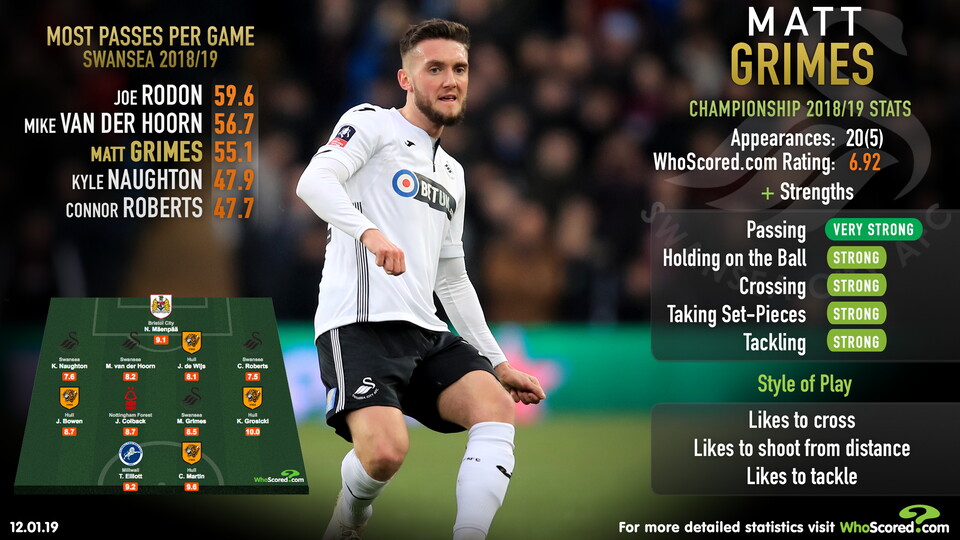 His man-of-the-match display at Reading pushed his average WhoScored.com rating for the season up to 6.92, that is the fifth best of all Swansea players this term, and you wouldn’t bet against Grimes controlling proceedings in the middle of the park once more.
