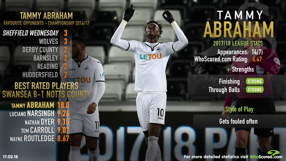 Football stats experts WhoScored.com focus on Tammy Abraham ahead of Swansea City’s Emirates FA Cup meeting with Sheffield Wednesday.